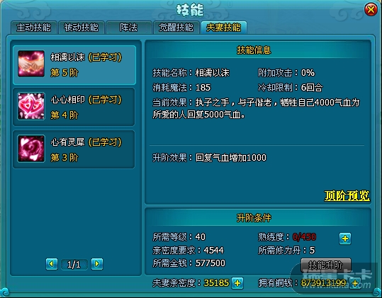 当获得夫妻技能后,攒够足够的亲密度与熟练度还可继续升级,提高技能效果。夫妻技能的效果