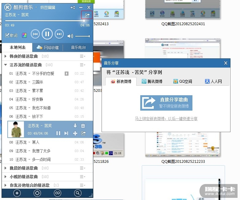 在试用瑞星的时候,看到了“微博推荐”的字样,开发一个像酷狗7那样的分享按钮。(如图所示)