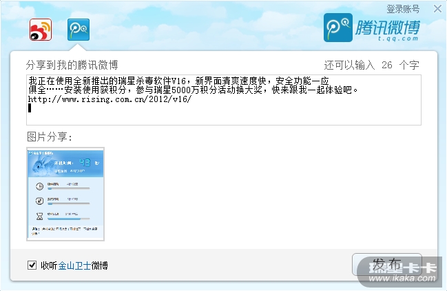 在试用瑞星的时候,看见“微博推荐”的字样,何不做成类似于酷狗分享按钮。(如图所示)