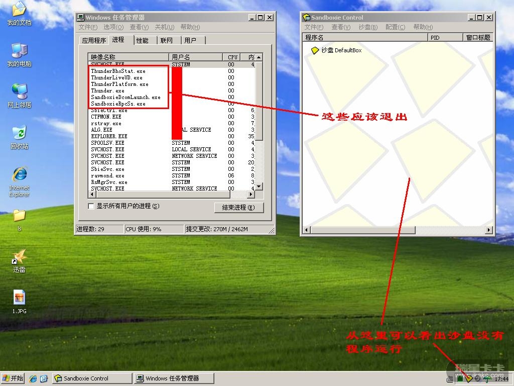 2、退出迅雷情况:沙盘中已没有程序运行,但任务管理器还有,注销系统后运行的程序也不能退出只有重新启动。如果没有重新启动再次运行就有的进程是3个了。