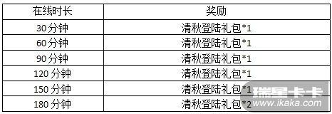 年9月19日08:00至9月22日23:59活动范围:全服活动规则:活动期间,玩家每日累计登陆至指定时长,即可获得系统赠送的清秋登陆礼包奖励。至尊VIP用户,活动期间每日登陆时间满180分钟,还将获得【VIP清秋礼包】*1。具体奖励如下: