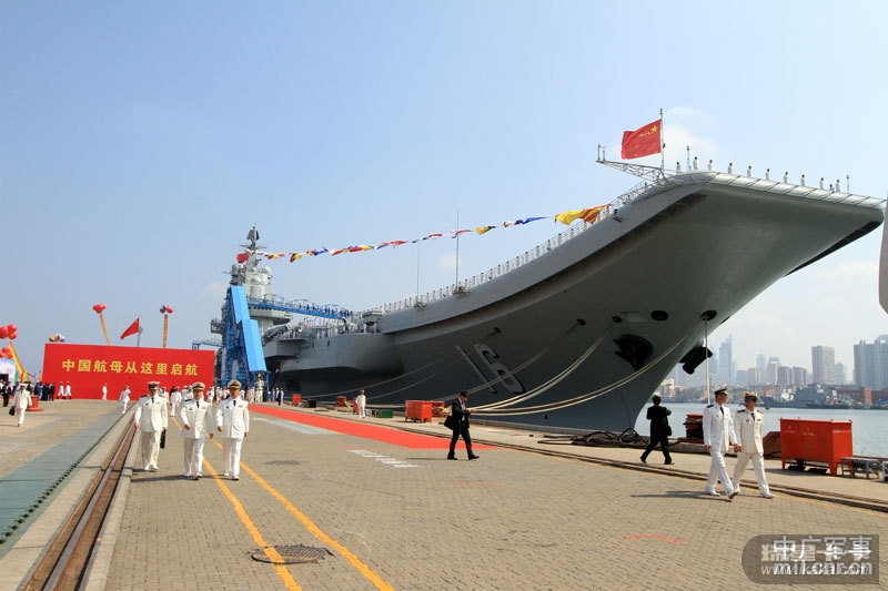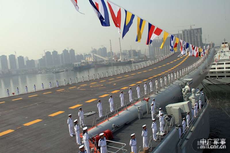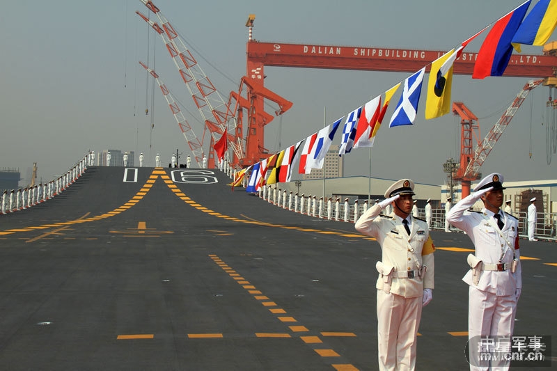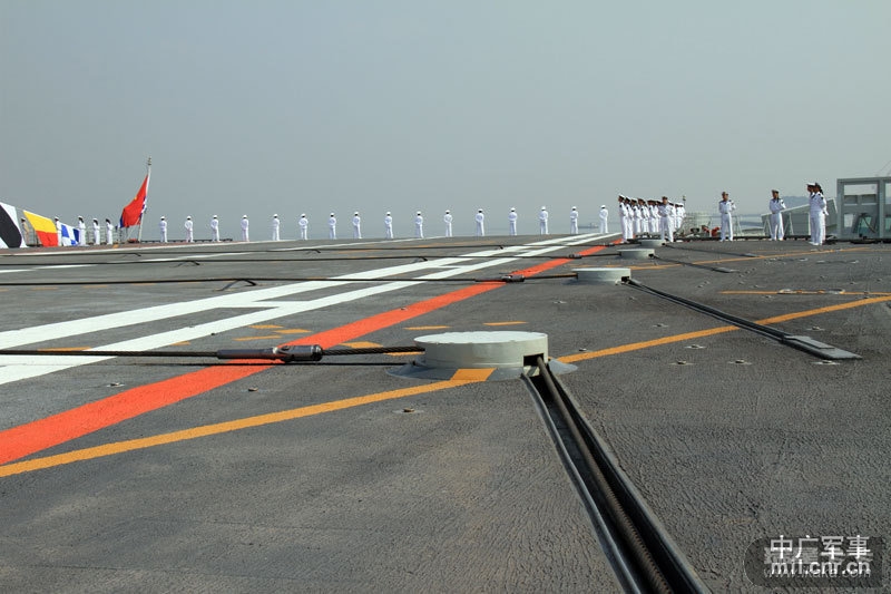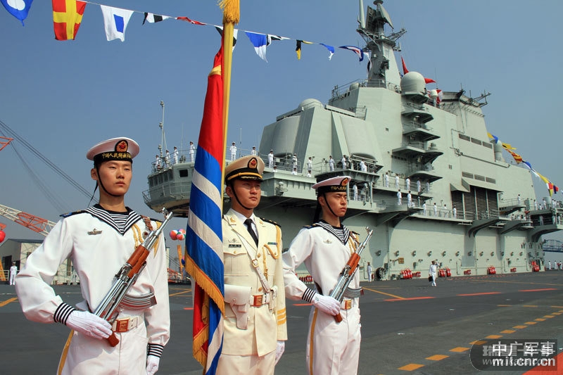 中广网大连9月25日消息:我国第一艘航空母舰“辽宁舰”已按计划完成建造和试验试航工作,今天(25日)上午在中国船舶重工集团公司大连造船厂正式交付海军。图为海军仪仗队官兵在辽宁舰上。中广军事记者梁永春 摄影报道