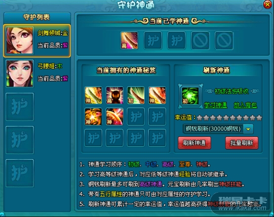 5.相应属性的精灵守护只能学习对应属性的攻击神通和护宠神通。比如金属性的精灵守护剑舞倾城只能学习金系攻击神通和金系护宠神通。