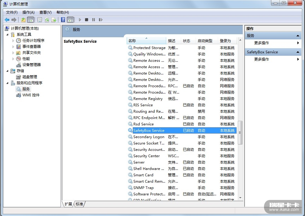 鼠标右键我的电脑——管理——服务和应用程序,在服务中,找SafetyBox Service服务