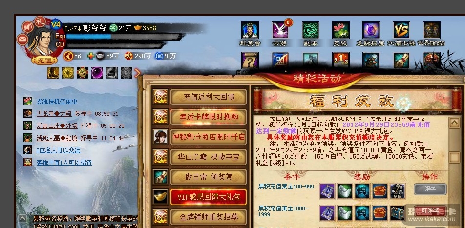 瑞星双线1区 彭爷爷 9月30前已累积充值300多 已经是VIP4的用户 回馈活动只能领取第2档奖励 要求处理和补偿