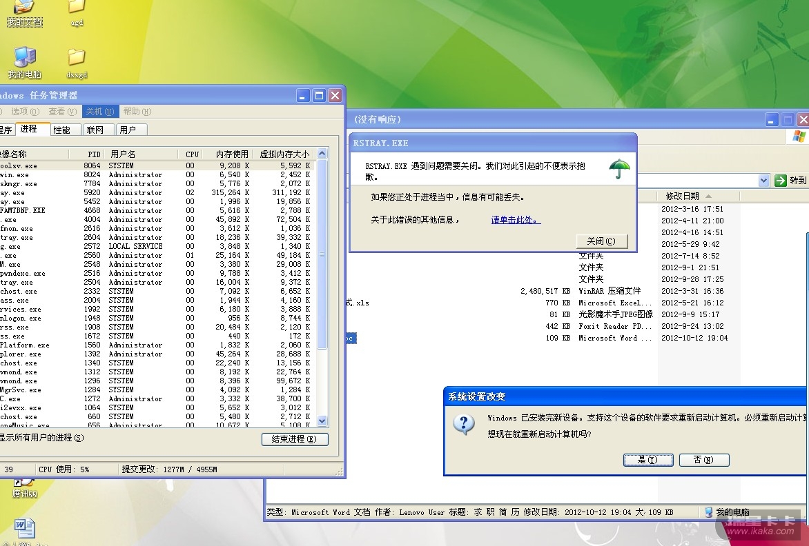 连接U盘,然后打开一个WORD文档,然后卡死,时间大约是一分钟左右,然后提示RSTRAY.exe遇到错误需要关闭,点击关闭之后,系统EXPLORER和WORDK进程才能正常继续运行.