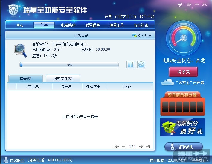 1、启用杀毒时,一直是初始化,不能进入杀毒;