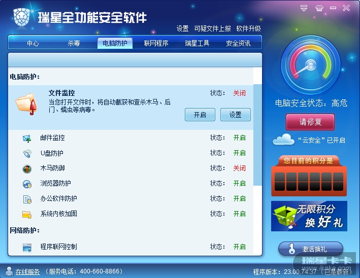 卸载瑞星全功能,下载安装V16,貌似一切正常了,但是速度奇慢无比,网页打开要30秒到1分钟,忍无可忍,卸载V16,一切正常了。开瑞星连Kaka网站都打不开了,卸载了才能上来讲两句。