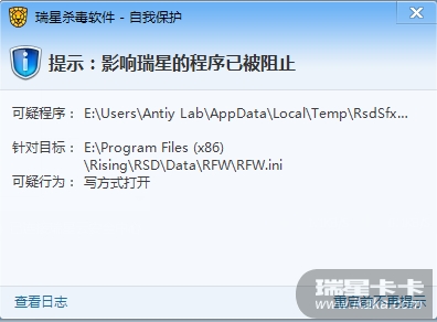 那个文件已经上传了。第一张图是防火墙安装时瑞星杀毒弹的窗口,那个所谓的可疑程序后面是\RsdSfxTmp\Setup.exe ( E盘是装win8的盘)