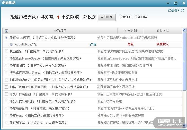 安全工具中的 系统修复,修复完再重新扫描,aboutURLS异常这一项仍然报危险,就是重复修复都没有修复好。痕迹清理 也是:其中 internet Explorer浏览器自动保存的标单和密码 这两项也是不能清理掉,重新扫描也复现要清理。XP3 IE8.0 瑞星安全浏览器 24.00.07.51
