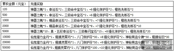 首充大礼活动期间,所有玩家首次进行任意金额的充值,即可获得价值为688元宝的活动首充奖励:幸运石*1、圣域仙草*1、神器之魄*1、三级攻击石*1、守护水晶*5、鲜花99朵*1(奖励每人只能领取一次哦,未进行过首充的玩家还可额外获得【首充礼盒】哦)2、