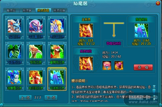 仙魔居添加妖灵吞噬功能,高品质妖灵可以吞噬低品质妖灵,获得低品质妖灵的所有经验,吞噬后继承两者最高的法宝,被吞噬的妖灵不会消失,但经验与法宝都会归零。