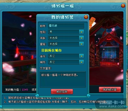 .缘分签信息中目前所在城市默认为其它,想要摇到同城的有缘人需要先修改所在城市。