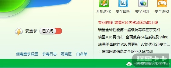 我关闭云查杀,开启云检查,右下角那个[已连接瑞星云.....]居然不能同步更新,关闭了之后,还得重新打开主界面才会显示[未连接瑞星云.....]