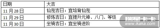 年11月28日08:00至11月30日23:59活动范围:全服活动规则:活动期间,为回馈广大仙友,每日将会有大吉运势,玩家若在当日进行相应的能力提升,将如有神助,水到渠成。每日运势预测如下: