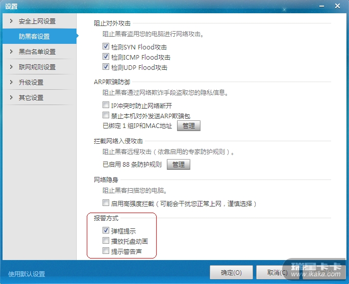 请您查看防黑客设置中,报警方式有没有勾选?如下图: