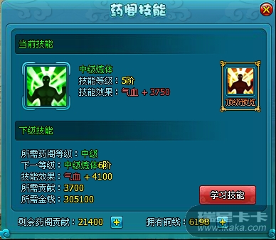 三、药阁功能1、学习药阁技能所有对药阁建设作出贡献的玩家都可通过药阁学习炼体技能,升级炼体技能可大幅提高人物基础气血。