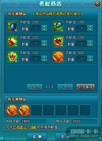 2、贡献兑换物品玩家获得的药阁贡献可直接用于兑换珍稀物品,随着药阁等级的提升可兑换的物品也会增加。