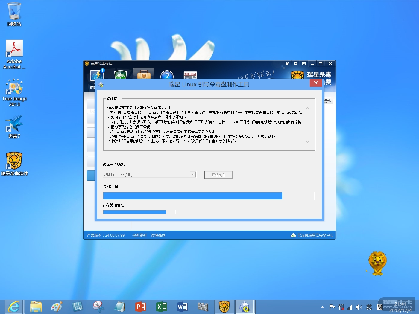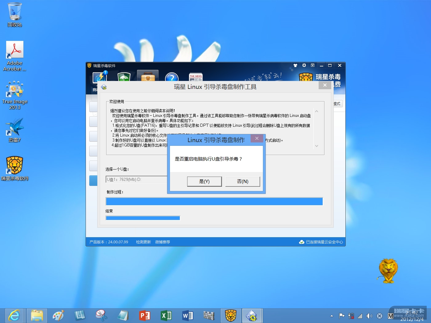 重启。U盘引导,可以执行Linux下杀毒。病毒库是2012-12-05的。