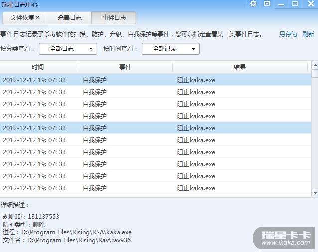 http://bbs.ikaka.com/showtopic-8616820.aspx点击瑞星日志中心界面那个倒三角,点备份日志,将日志db文件导出压缩跟帖上传。