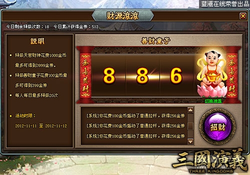 眼看着圣诞老人隆重登场,连送大礼赚足眼球。咱们的老祖宗财神可有点按耐不住啦!你方唱罢我登场,12月24日当天开启的“财源滚滚”抽奖活动,天宫财神和善财童子将会轮番出场。财大气粗的玩家们可以选择在天宫财神处花费2000金币进行拜祭,最多可以获得5999金券的丰厚奖励哦!而像小编一样囊中羞涩的玩家也不必灰心,每次抽奖只需花费200金币的善财童子会竭诚为大家服务。最高599金券的奖励也是相当诱人滴!
