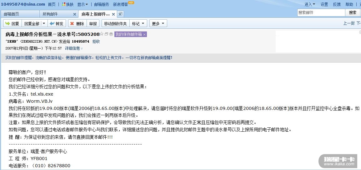 今天打开邮箱突然想起2006年给瑞星发的病毒文件时的反馈邮件!这也算是我与瑞星第一次互动吧!