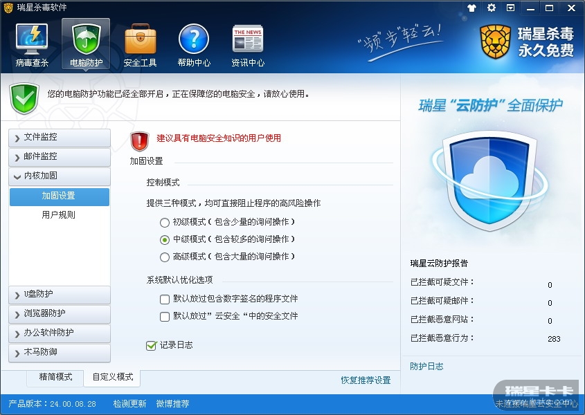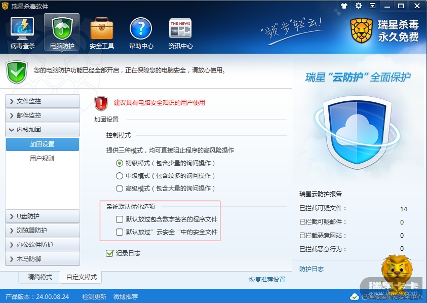 我没有楼主专业,所以基本上使用的是v16的默认设置。关闭“文件监控”速度快了不少,打开“文件监控”就变成牛车了,真心希望瑞星能改进。毕竟现在向瑞星这样的专业杀毒公司已经所剩无几了。也希望专业的杀毒软件公司能够积极参与到政府网络安全建设的政策制定中,坚决打击流氓杀毒软件公司,还大家一个纯净的网络世界。