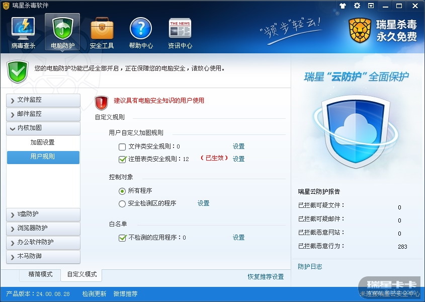 本帖中提到的问题,经过今天上午近2个小时的远程协助现场,最终在win7系统下找到了原因,希望瑞星后续改进对系统服务的依赖,增加本帖中提到的建议,例如在V16中恢复2011版的系统内核加固模板(初级、中级、高级)并增加注册表自定义项中的导入和导出功能,同时减少右下角的提示信息(设置为可以选择不再提示,或者在设置界面中选择不弹出任何提示)否则右下角弹出一个提示就要选择【不再提示】太麻烦了,最后希望瑞星能够越早越好,继续走专业的道路,谢谢了!