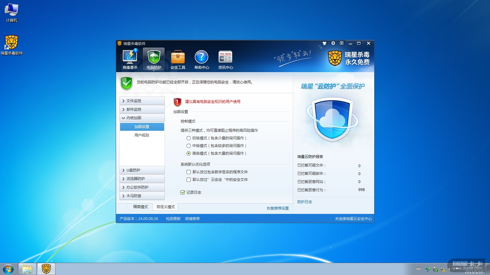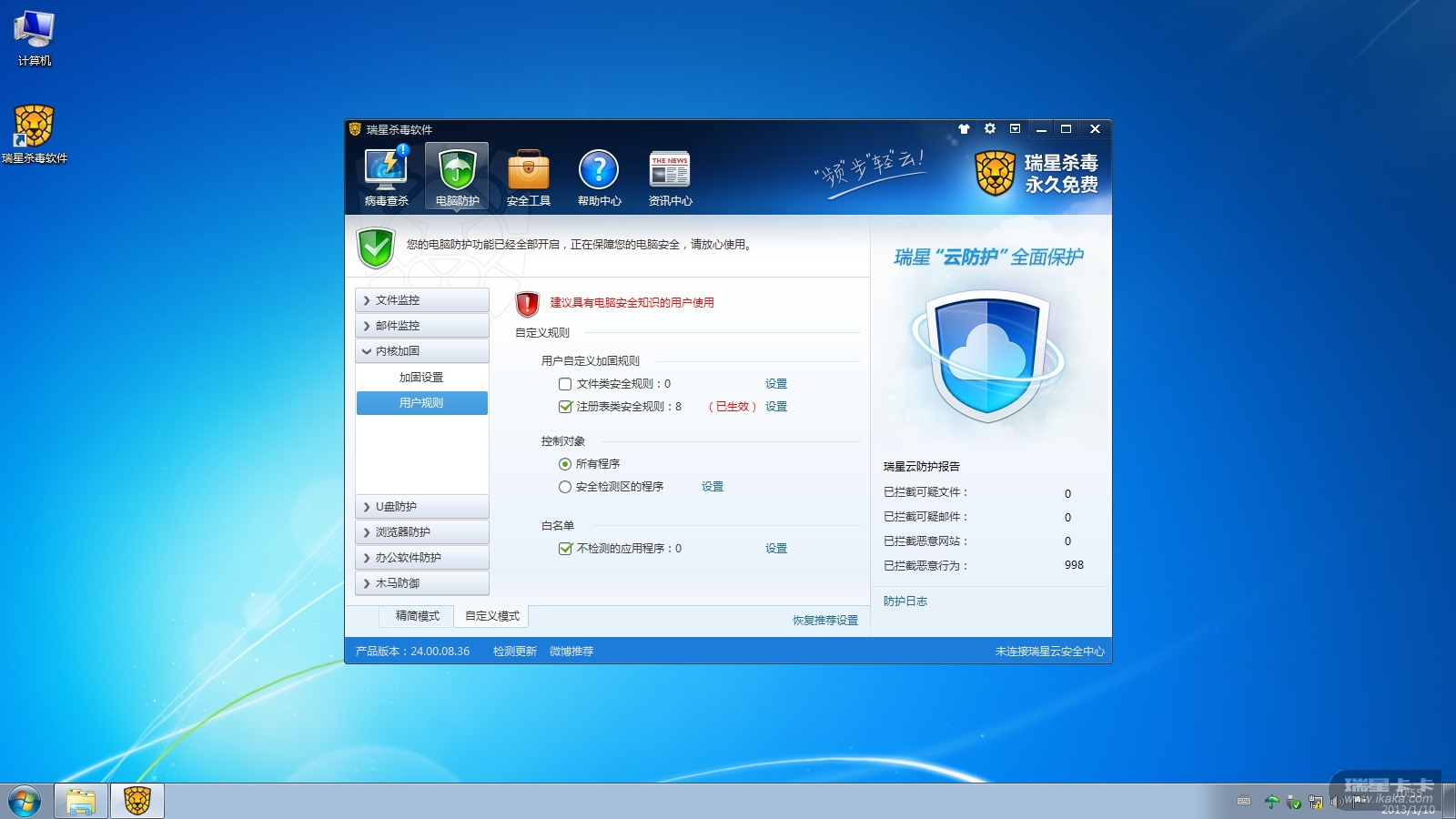 今晚给这台之前被各种流氓软件折磨到崩溃死机的电脑重装系统后,再次看到了老人欣慰的微笑,最终卸载了V16版和防火墙2012版,清理注册表后,重新安装了瑞星2011版和之前的瑞星防火墙,系统注册表和启动项锁定功能立即生效,特别说明:不管瑞星2011还是V16,【popwndexe.exe】进程都是彻底禁止运行和启动的!