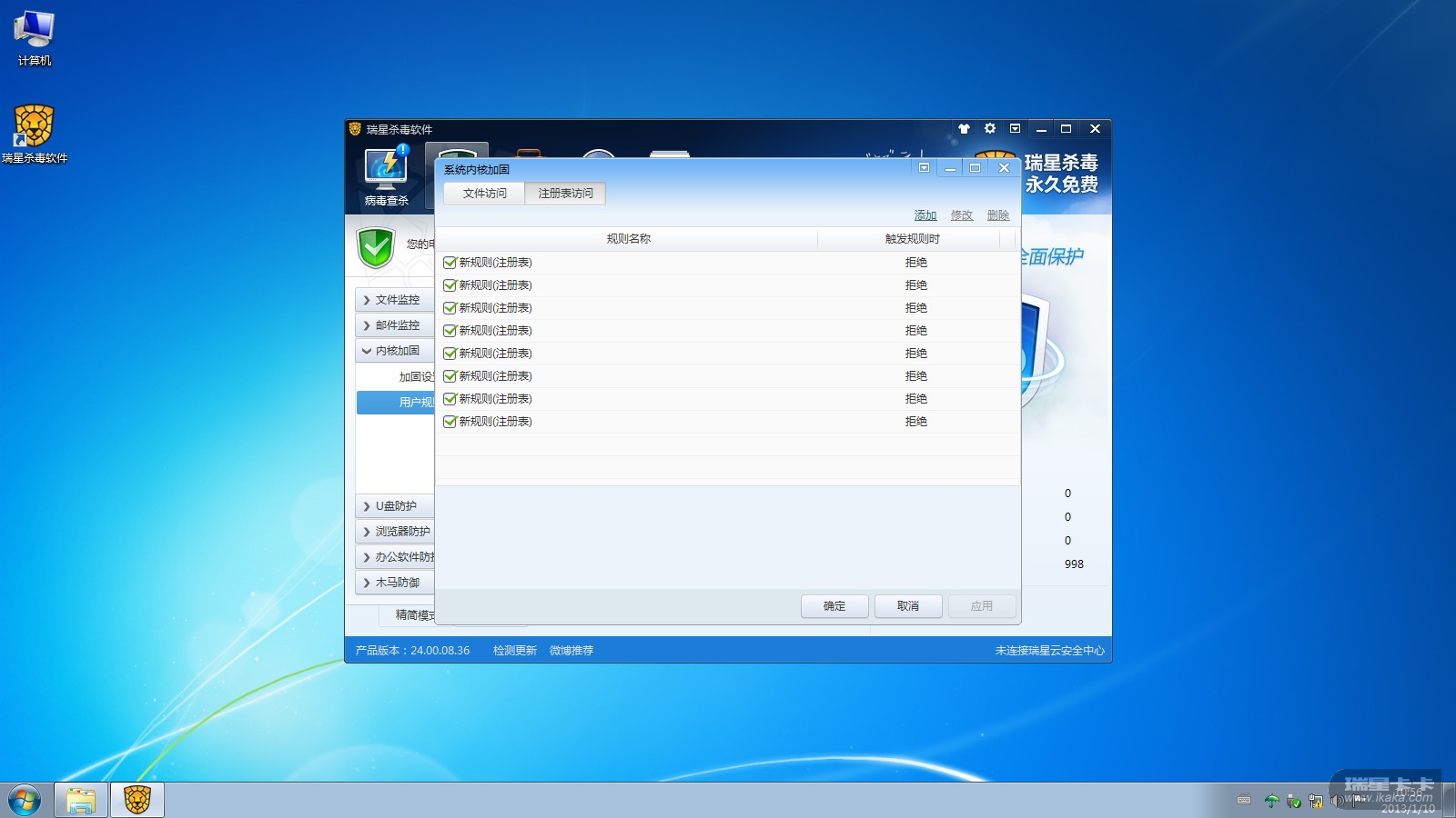 我今晚再次抱着希望,给一位新用户(60岁的老人)全新安装了XP SP3系统,安装了瑞星防火墙2012版(这个版本也不想多说,因为我从来不用这个版本)和瑞星V16版,修复了2012年12月以来的所有严重和可选漏洞补丁,并安装了绿色版软件,经过反复测试,在瑞星V16版中的系统加固中添加的10几项注册表拦截规则均无效,系统启动项可以被轻易篡改或删除,请瑞星工程师对“系统内存占用和影响方面,V16是远远好于2011的”和“您提到的锁定注册表功能无效的问题,经测试不复现”这两句话负责,我本人是讲究事实的,每天都在给不同的电脑安装各种纯净原版且绝对敢保证用户稳定安全的系统,对于杀毒软件,多年来也一贯推荐使用瑞星,从未动摇过,经过今晚的再次测试瑞星V16新版本,再次感到失望,如果这个版本真的有问题,且瑞星官方不愿意承认,那么大家心知肚明就好,但再次恳求日后不要停止对瑞星2011版的升级就好了,至少我近几年内是不会使用64位系统的!