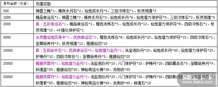 活动期间,每累积充值1000元宝,奖励四级宝石盒*2、橙色洗练石*2、仙宠精魂·紫*2、八门保护符*1、妖灵残魂*1、魔晶碎片*1、幸运金币*2。