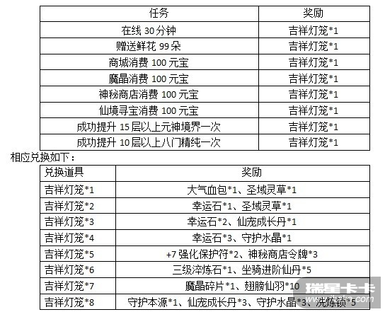 活动期间,完成相应的任务可获得系统赠送的【吉祥灯笼】,集齐一定数量的【吉祥灯笼】可以在活动相应面板兑换奖励。