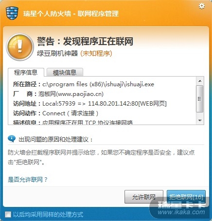 请将ishuaji.exe 加上数字签名,防火墙就不会再提示了。