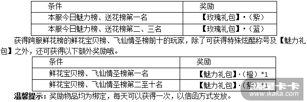 活动期间,玩家间在本服今日魅力榜、送花榜排名前三将会获得额外的排行奖励。