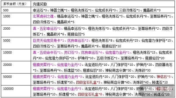 温馨提示:单笔充值奖励可重复领取,不设上限,奖励物品均为绑定,以信函方式发放。3累积充值大礼活动期间,累积充值达到指定额度,还可以获得以下超值丰厚的奖励哦!