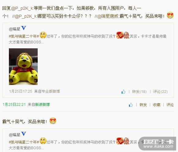 瑞星市场总监唐威微博上说,本周一盘点一下,有可能送给此次活动每一位入围的童鞋一个卡卡公仔。O(∩_∩)O哈!请小二落实一下,到底送不送啊?