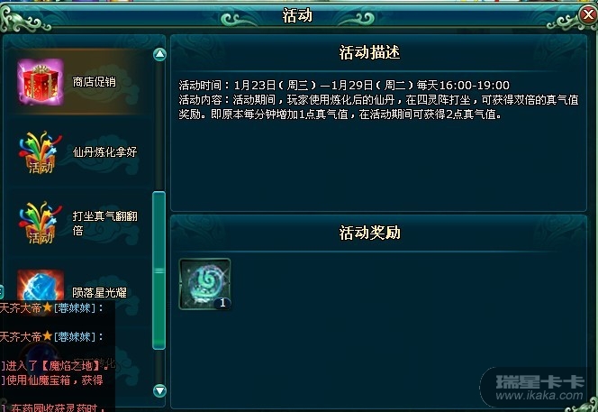 这个活动是1月23日到1月29日每天16:00-19:00,坐四灵炼丹药,真气值是双倍的,原本1点,活动期间是2点,可是为什么我们16:00后还是1点真气值呢?