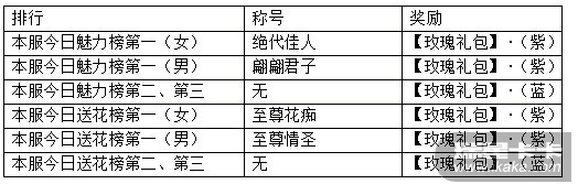 活动期间,玩家间通过赠送鲜花、获取鲜花超过99朵,且在本服今日魅力榜、送花榜排名前三将会获得额外的排行奖励。对应称号、奖励如下: