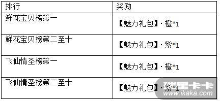 获得跨服鲜花榜的鲜花宝贝榜、飞仙情圣榜前十的玩家,可获得以下额外奖励哦。