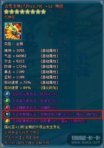 控制强化石可以增加控制技能的成功率,但只能镶嵌在坐骑的强化附加孔上,且只能镶嵌一个。