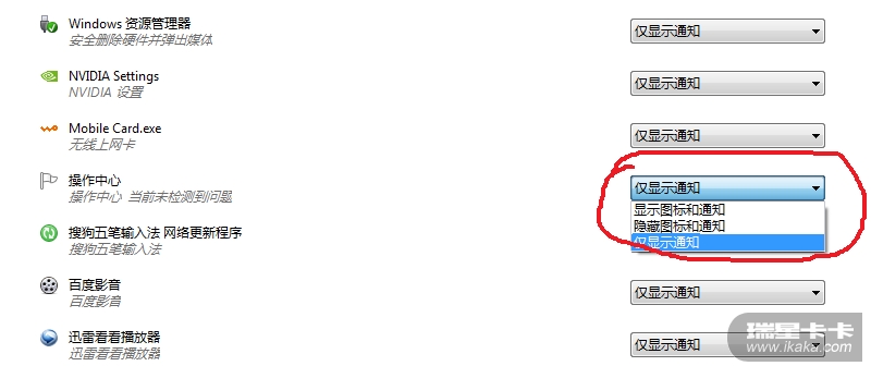 再次提醒:不建议彻底关闭任务栏中的操作中心提示。此提示图标有时会通过给用户非常有用的信息。比如:中了AVKILL之类的病毒和,这个图标上会有一个红叉。