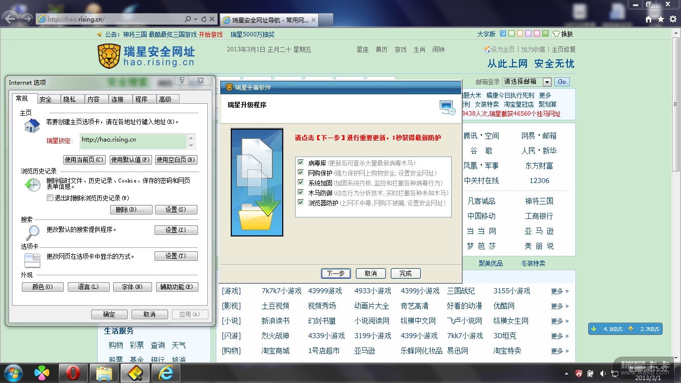 已通过QQ联系您,您的默认浏览器的默认首页不是瑞星网址,所以会有弹窗提示。