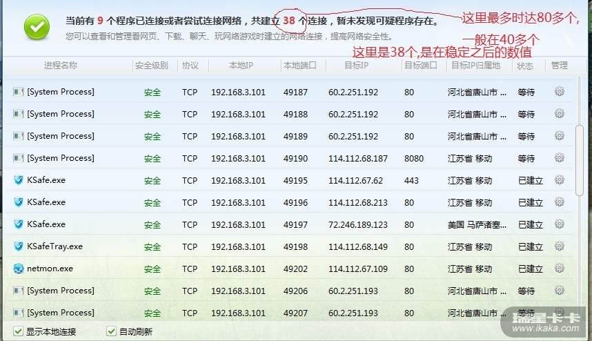 我用的win7系统,现在(以前没有注意这个不知道刚装完系统是否存在)发现刚开机什么也没有做,用工具查看有很多连接最多时达到80多个,这个问题我一直困扰我,很纳闷,想知道是那个程序发起的,可怎么查也查不到,用瑞星、金山等杀毒软件都说正常。可我什么也没做,那里来的那么多连接,一般情况下40多个,只有几个我是知道是那个程序建立的,其它的就不知道了,下面我以在装金山杀毒软件下的情况连接说明。在启动文件夹里放如一个执行批处理文件,文件里有2条命令,分别是netstat -ano 和tasklist /svc。程序执行的结果在附件里。我想知道怎么才能找出那些建立连接的程序,它们藏在那里,那里又是它们的入口点,希望有人能给我指点一下,谢谢!