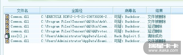 每次查杀均显示有病毒或者可疑文件,有的显示清除成功,有的显示已忽略。显示已忽略的文件点右键,选择删除文件或者清除病毒后,显示延迟删除或者重启后删除。