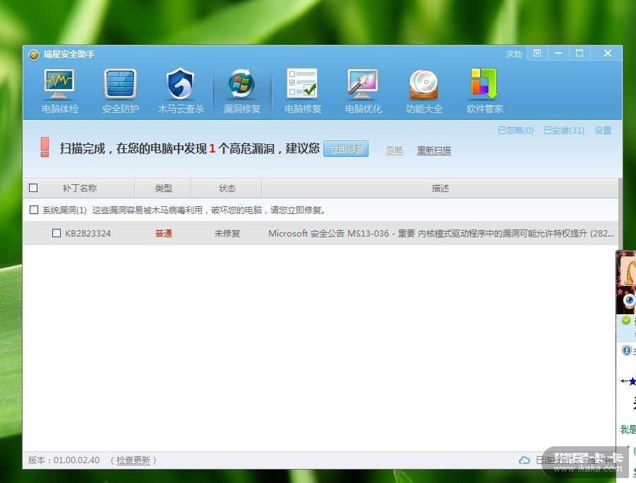 这个补丁微软已经撤回了,瑞星安全助手应该清除该补丁