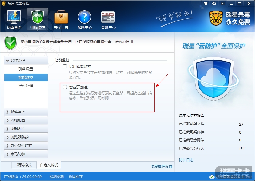 不是变频查杀,变频查杀是降低资源占用的,简单的来说,安全软件在扫描的时候会占用内容较大,变频就是智能调节,一会占用大,一会占用小,这样在扫描的过程中,用户就不会觉得卡,如果杀软一直内存占用很大的话会造成卡死。查杀加速,主要是瑞星的云加速,和瑞星的云查杀引擎在起作用。云加速,就是把用户PC端的文件进行MD5值对比,进行云端加速,所以,首次扫描之后的扫描速度会加快很多,有点像金山和360的预先扫描,但是又不同,和江民云加速概念,框架一样,但细节有所不同,但在我使用的过程中还是瑞星的云加速比较明显。:kaka1: