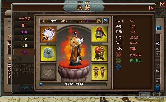 版主,3楼的第一张图就是法正的概括图了,里面可以看到法正的全部概括,我的法正没有技能,我知道你的意思,你是想问我是不是传承失败。但我的问题是传承列表里面没有法正这个人,是显示不出有法正,我是想要用法正传承,但是法正没在列表显示、看不见,根本就没办法传承。