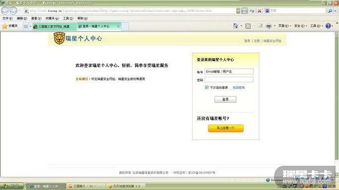 用IE点击“进入一区”有1/3机会进入瑞星个人中心登录页面,有2/3机会进入漆黑状态;