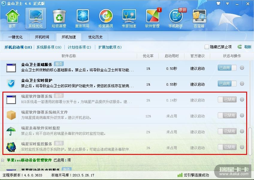 操作:使用金山卫士开机启动功能,禁用瑞星启动项