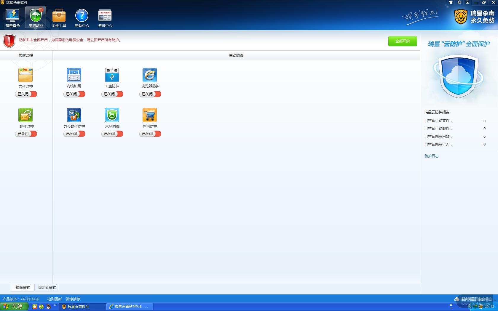 杀毒软件升级为V16后,安全防护提示全部关闭,手动也打不开,请问为何?以前版本的安全防护是全开的